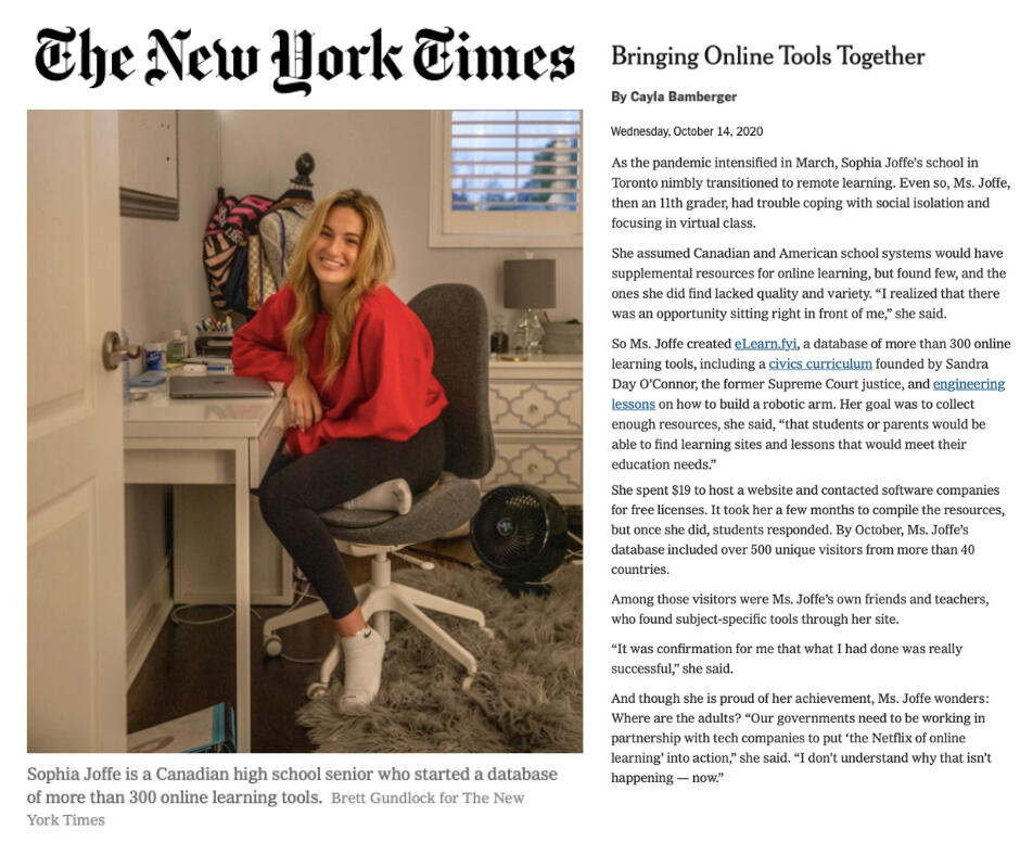 Hello, I'm Sophia Joffe, a Bachelor of Commerce student at Queen's University's Smith School of Business.In my senior year of high school, I founded eLearn.fyi at the start of the Covid-19 outbreak in March 2020.My goal was to help solve a critical challenge - how to bridge the learning quality gap between online learning and in-class instruction.eLearn.fyi’s 300+ curated learning sites have supported over 50,000 students from more than 125+ countries worldwide.While the pandemic accelerated the move to online learning, it also amplified another problem -- how learning loss disproportionately impacted students of single parents, minority groups, lower-income families and kids in vulnerable situations.Please learn more about me at LinkedIn.
